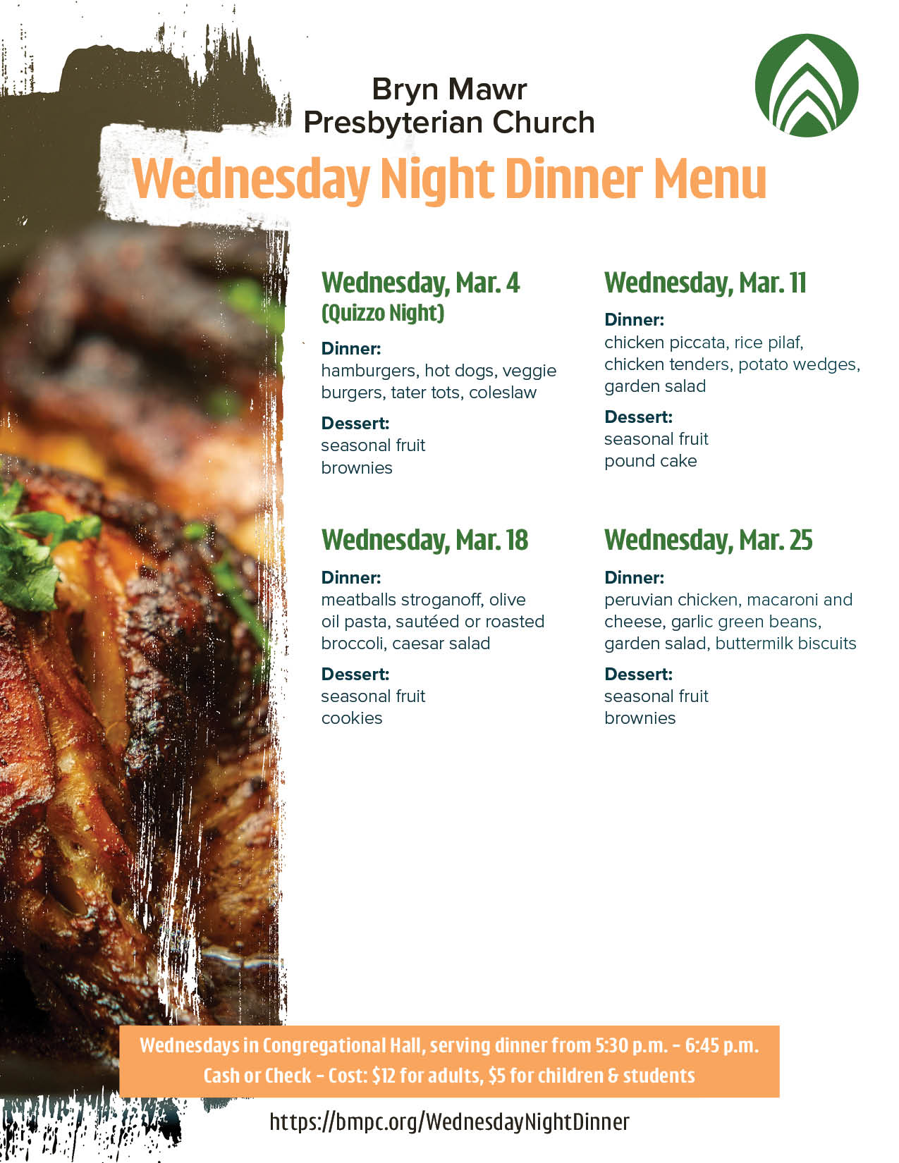 Come gather for Wednesday Night Dinner—a weekly opportunity to enjoy a warm, catered meal and connect with others in the BMPC community.