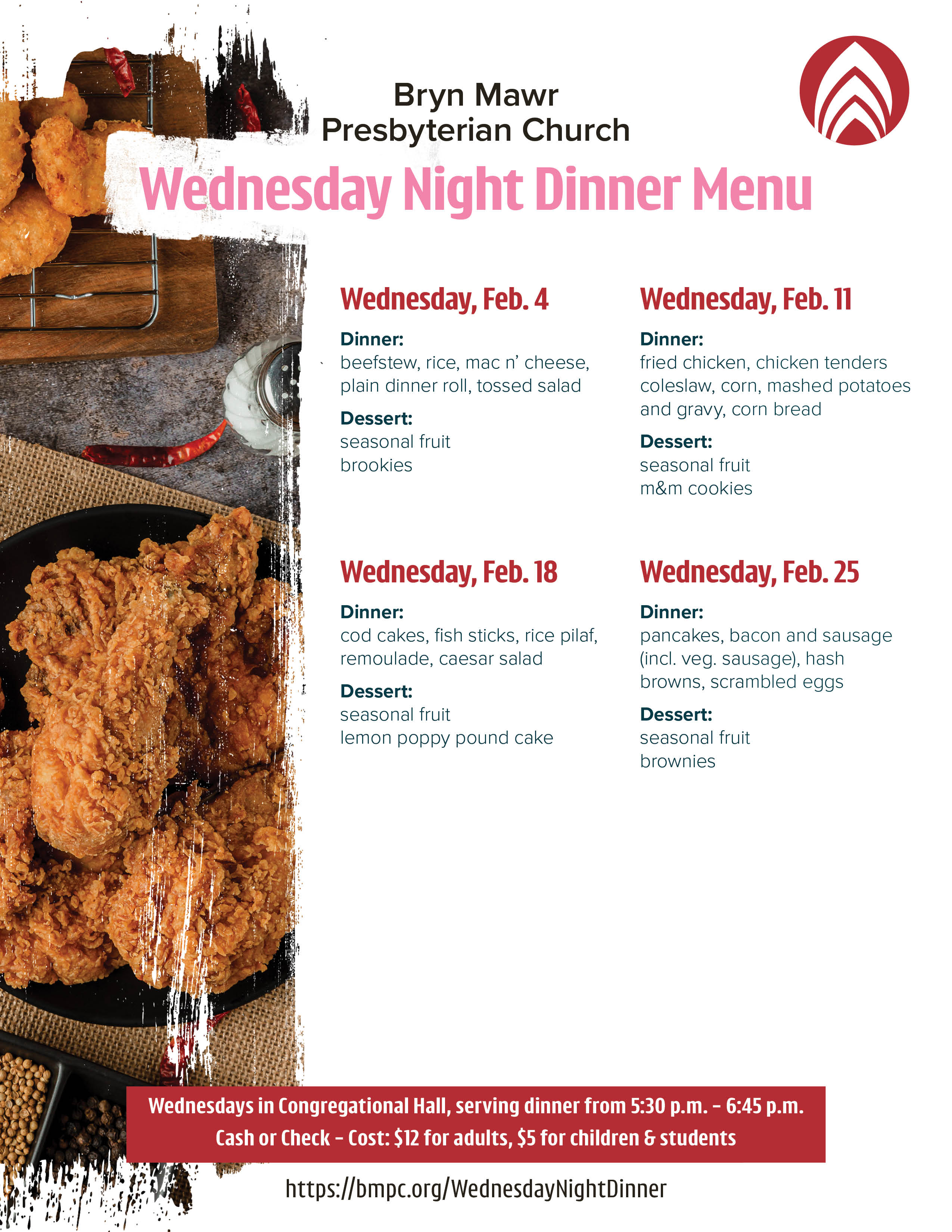 Come gather for Wednesday Night Dinner—a weekly opportunity to enjoy a warm, catered meal and connect with others in the BMPC community.